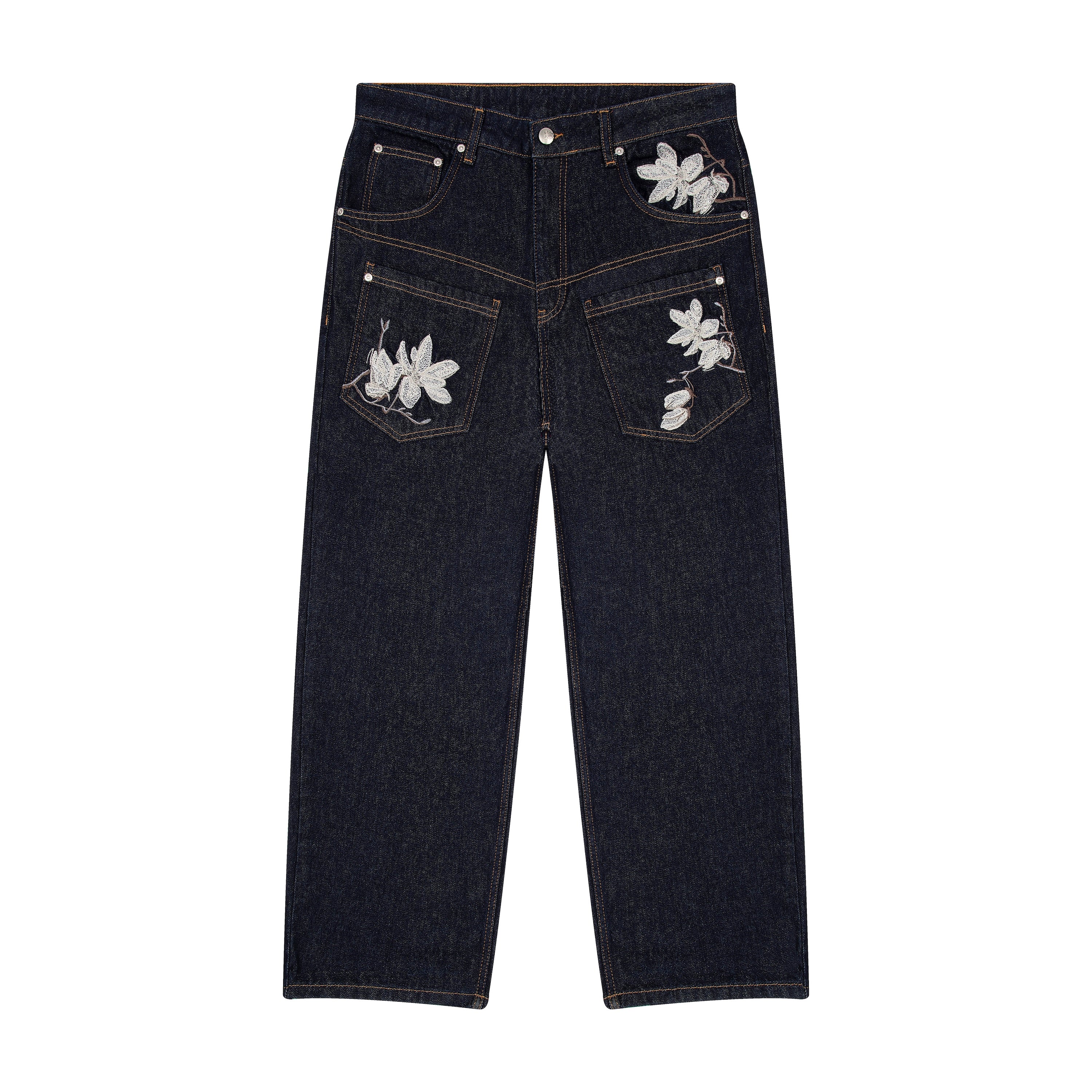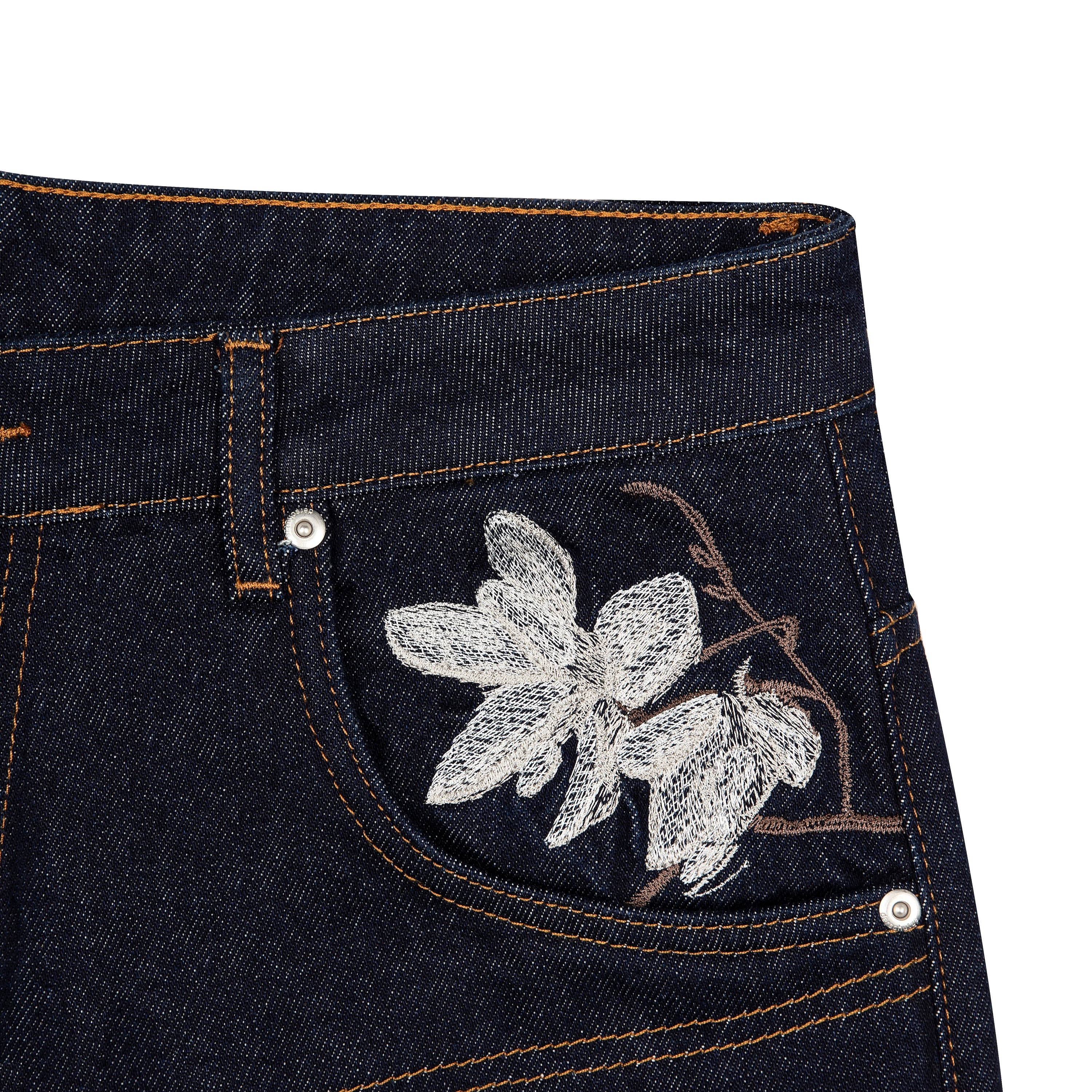 14,5oz raw denim / 100% cotton / yoke and back pocket look on front / embroideries on front pockets / plaid patterned deboss printed leather patch / custom button / baggy fit / fabric may bleed or fade, wash inside out in cold water to preserve color and character / fits true to size